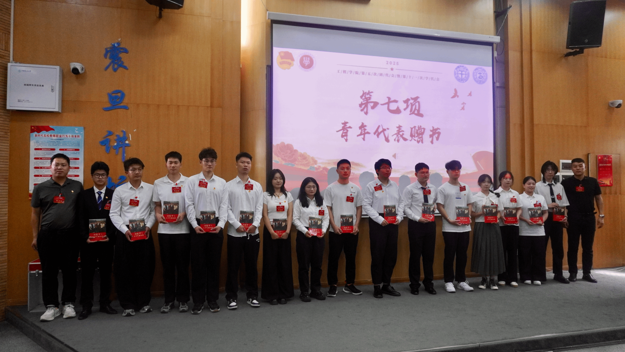 皇冠线路检测(中国)有限公司官网党委副书记高晓东和挂职团委副书记刘浩为今年在“五月的鲜花”2025年五四评优活动获奖的优秀青年和集体、皇冠线路检测(中国)有限公司官网“十大标兵学生”赠书。